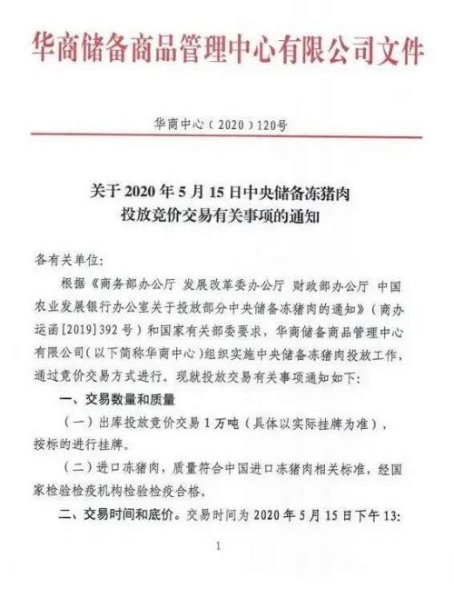 5月12日電 12日,華儲網發布《關于2020年5月15日中央儲備凍豬肉投放競價交易有關事項的通知》稱,5月15日將出庫投放競價交易1萬噸中央儲備凍豬肉。