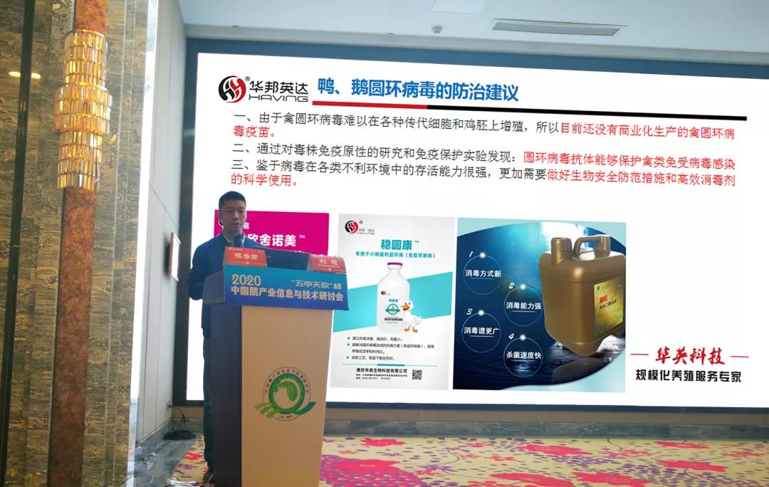本次會議中,華英科技水禽事業部技術總監劉超受邀針對《圓環病毒對鵝的危害》做專題報告。劉總監分別從圓環病毒的致病機制、傳播、感染現狀及危害、臨床表現及病變、防治建議等方面,結合市場實際案例對圓環病毒進行系統的剖析,為市場一線此類疾病的防控提供了重要的依據。