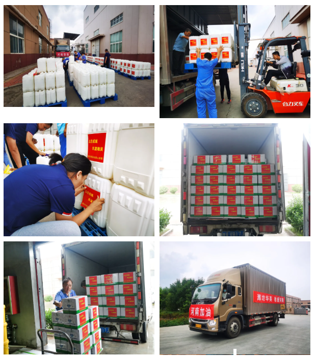 一方有難,八方支援,來自全國各地的志愿者及救災物資涌向災區,為災區人民抗洪救災提供保障。濰坊華英生物科技有限公司愛心捐贈20噸消毒劑,助力河南災后重建,和河南同胞一起共渡難關。