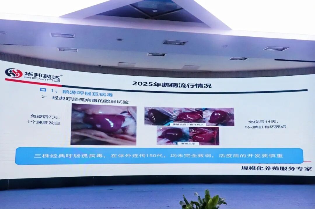 作為本次大會的協(xié)辦單位及技術(shù)驅(qū)動的重要力量,濰坊華英生物科技有限公司(以下簡稱“華英科技”)深度參與會議交流。公司研發(fā)總監(jiān)王宏華博士在大會上作《2025鵝病流行動態(tài)及防控技術(shù)》專題報告,分享了基于大量一線數(shù)據(jù)的研究成果及防控解決方案,引發(fā)參會人員的廣泛關(guān)注。