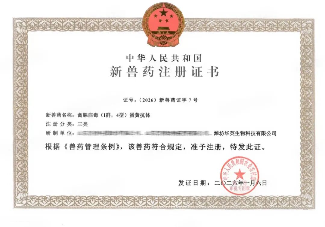 近日,濰坊華英生物科技有限公司在動物疫病防控領域再傳捷報——其針對禽腺病毒(I群,4型)蛋黃抗體產品成功榮獲國家新獸藥證書。這一重磅成果,標志著公司在禽用生物制品領域的創新實力再次獲得官方持續認可,也為養殖業防控禽腺病毒感染提供了又一可靠的利器產品。