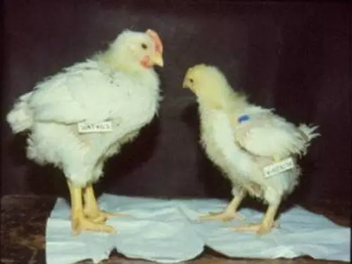 患病雞羽毛粗亂,相對(duì)正常雞個(gè)體明顯偏小,雞爪蒼白(左側(cè)為對(duì)照)