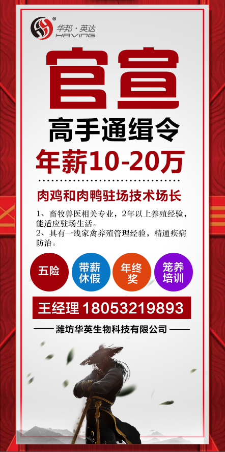 肉雞、肉鴨駐場技術場長 華英科技 招聘人才 肉雞、肉鴨駐場技術場長5名 1、畜牧獸醫相關專業,具有2年以上的肉鴨養殖經驗。 2、具有家禽養殖管理、預防保健、疾病防治、技術服務等臨床經驗。 3、公司定時提供技術培訓,月休4天,年薪10-20萬。 咨詢電話:王經理 18053219893 上一篇: 11月17日肉苗雞行情分析下一篇: 11月17日肉毛雞行情分析