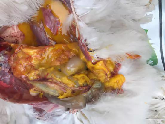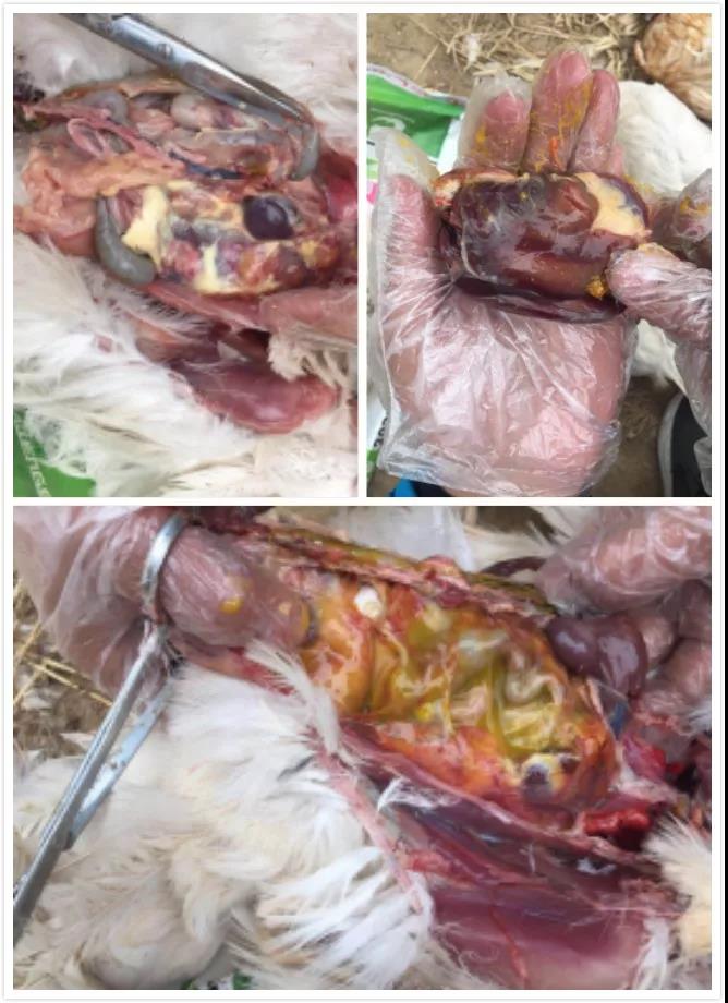 山東聊城冠縣某蛋雞養殖場,存欄15000羽,分成三棟雞舍飼養,每棟5000羽。其中一棟160日齡,最近兩天一直出現零星死亡,死亡率在千分之一左右。大群精神狀態正常,個別肛門周邊羽毛潮濕,采食量正常,產蛋率一直在持續上升。剖檢:白色包心包肝、卵泡發育正常、腹腔內有蛋黃樣液體、腥臭、有腹膜炎。