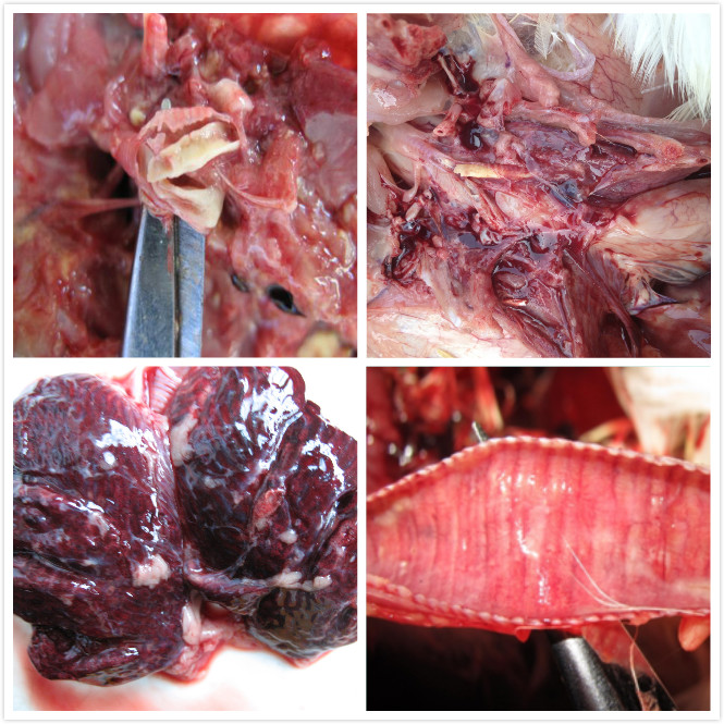 針對雞群咳嗽、呼吸困難、閉目縮頸、死亡的雞爪子鮮亮,剖檢可見氣管發紅或透明、肺出血、支氣管栓塞、肺栓塞、氣囊炎。