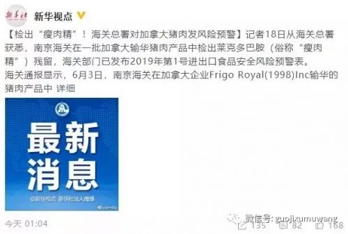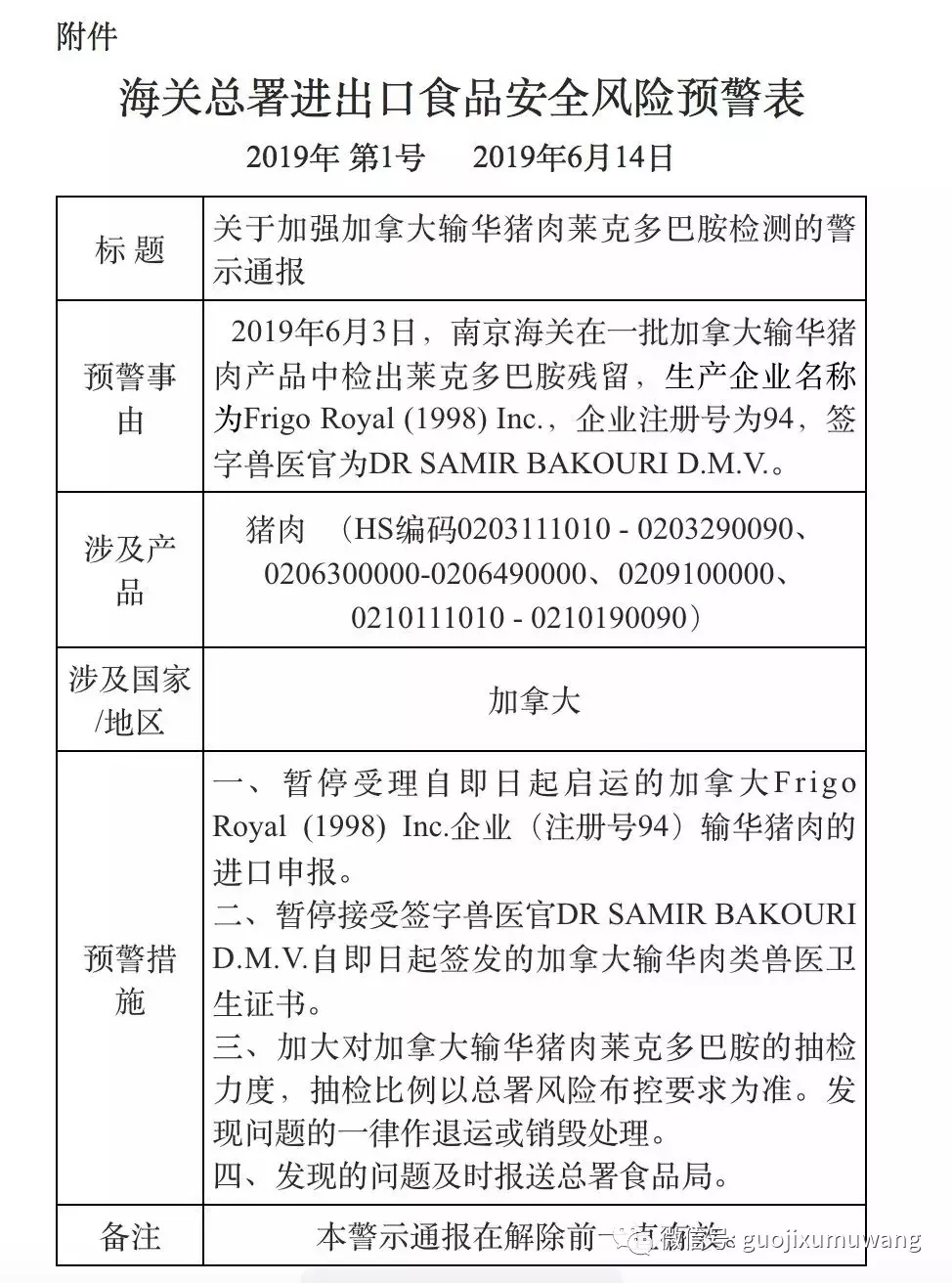 ? ? ? ? ?據新華社18日援引海關總署稱,南京海關在一批加拿大輸華豬肉產品中檢出萊克多巴胺(俗稱“瘦肉精”)殘留,海關部門已發布2019年第1號進出口食品安全風險預警表。
