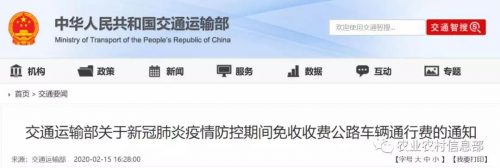 交通運輸部:17日0時起所有收費公路全部免收通行費,直到疫情防控結束。